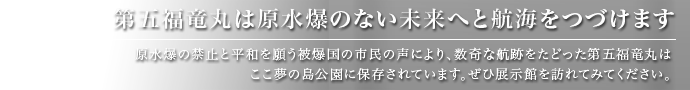 第五福竜丸の被災、ブラボー実験、事件のスクープ、乗組員の被害、久保山愛吉さんの死、マグロ騒動、放射能雨、原水爆禁止の声の高まり、マーシャル諸島の被ばく者、世界の核実験、ラッセル=アインシュタイン宣言、保存運動、エンジンと展示館など